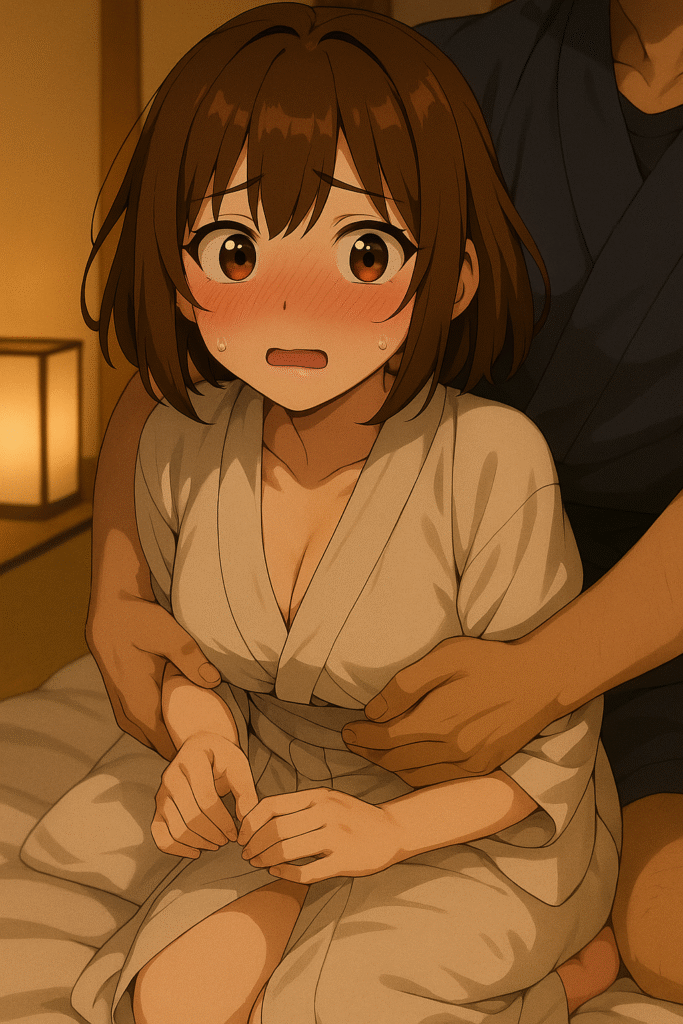 旅館の夜、浴衣姿でじゃれ合うふたり。 何気ない仕草に笑いがこぼれ、距離が少しずつ近づいていく。 ふいに後ろから抱きしめられて、彼女はハッと息をのんだ。