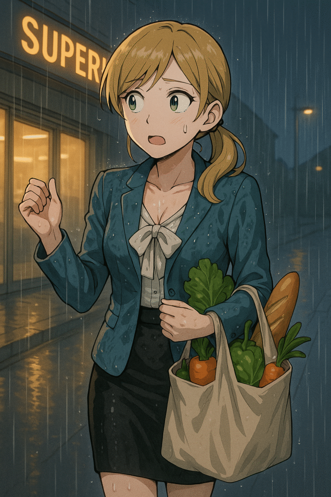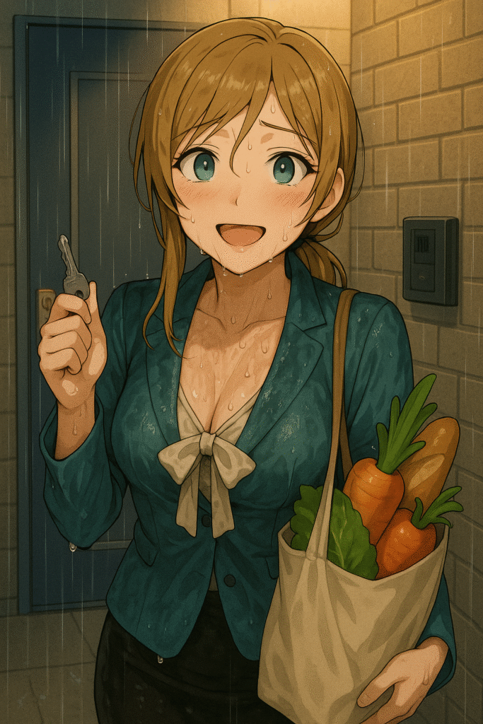 ビジネス英会話教室の先生とスーパーで偶然再会。帰り道に突然の大雨に遭い、びしょ濡れのまま先生の家の前へ──。